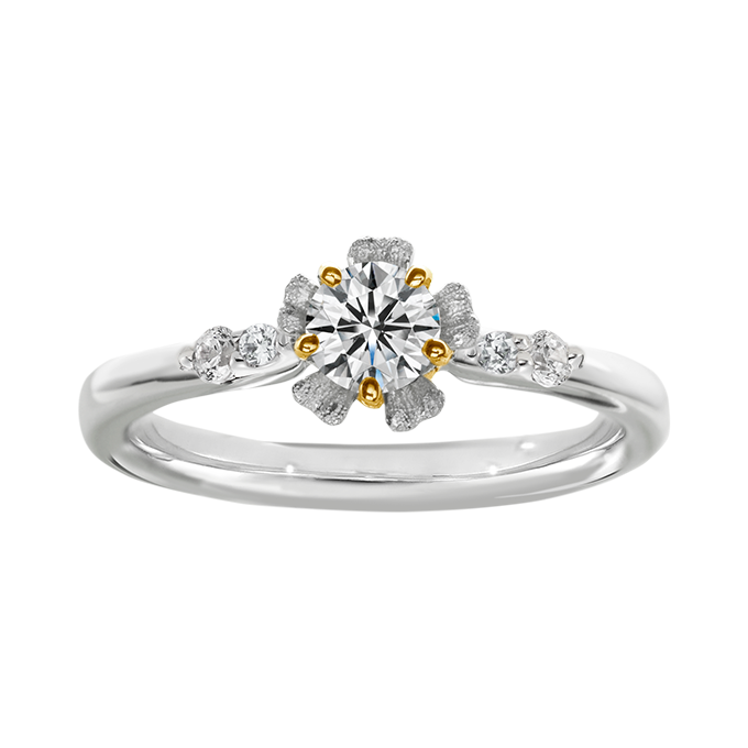 「花」。永遠に色褪せることなく咲き誇る愛の花。それはパートナーの愛を受けて、心の中に咲きつづける。花びらモチーフを大きめのメレダイヤで囲んだ華やかなデザイン。